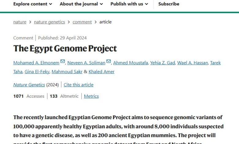 نشرت مجلة (Nature) العالمية مقالة علمية عن مشروع الجينوم المرجعي للمصريين وقدماء المصريين، تحت عنوان مشروع الجينوم المصري (The Egypt Genome Project)، وذلك في عددها الصادر بتاريخ ٢٩ أبريل.