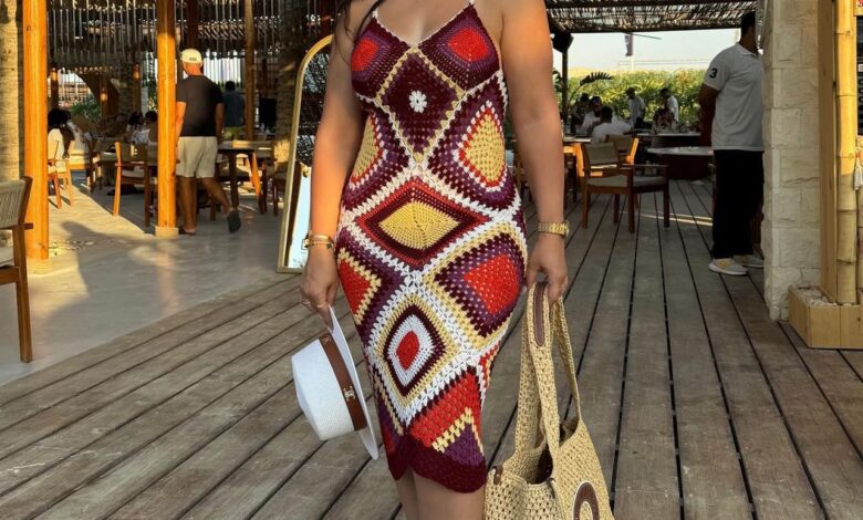 الفستان الذى ارتدته بوسى فى الجلسة مطابق تماماً لفستان حسناء لوناً وتصميماً وهو مصنوع من التريكو بخيوط ملونة جميلة