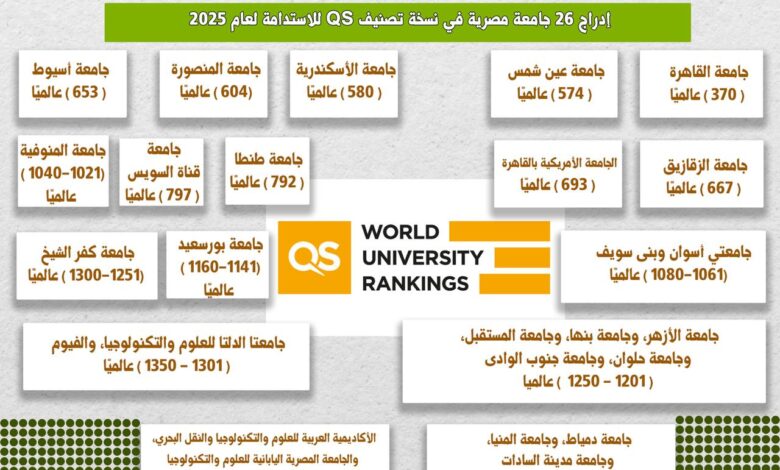 تقدم جديد للجامعات المصرية في نسخة تصنيف QS للاستدامة لعام 2025 _ إدراج 26 جامعة مصرية في هذا العام بزيادة 3 جامعات عن العام الماضي