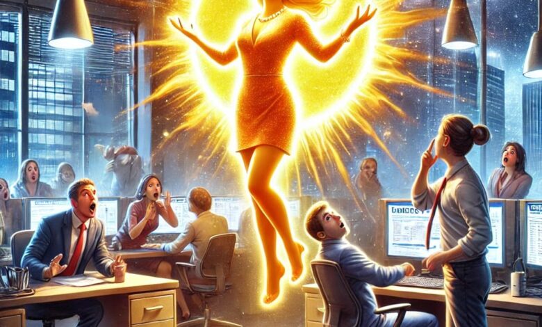 نظر إليها الجميع بذهول… ثم بدأ ضوء خفيف يشعّ من عينيها. في لحظة صمت مطبق، قال رئيسها وهو يبتلع ريقه: – إنتي… بجد الشمس؟ ضحكت وهي تمسح دموعها، ثم وقفت وسط المكتب ورفعت يديها عاليًا… وفي لحظة خاطفة، انبعث نور ساطع ملأ الغرفة. – آه يا بشر… استريحتوا شوية؟ يلا قوموا اشتغلوا، مش هرجع لوحدي!”