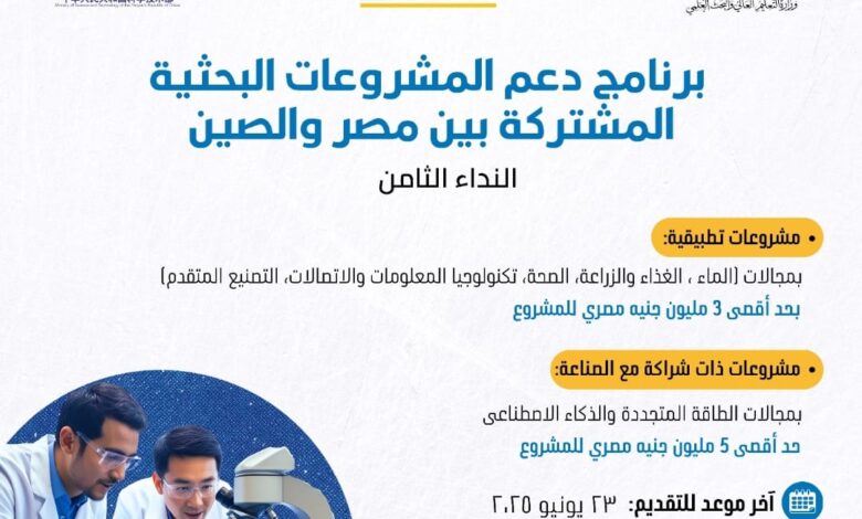 تعلن هيئة تمويل العلوم والتكنولوجيا والابتكار (STDF)، بالتعاون مع وزارة العلوم والتكنولوجيا بجمهورية الصين الشعبية، عن فتح باب التقدم لبرنامج دعم المشروعات البحثية المشتركة بين مصر والصين في دورته الثامنة، والذي يهدف إلى تعزيز التعاون بين الجهتين في المجالات ذات الاهتمام المشترك