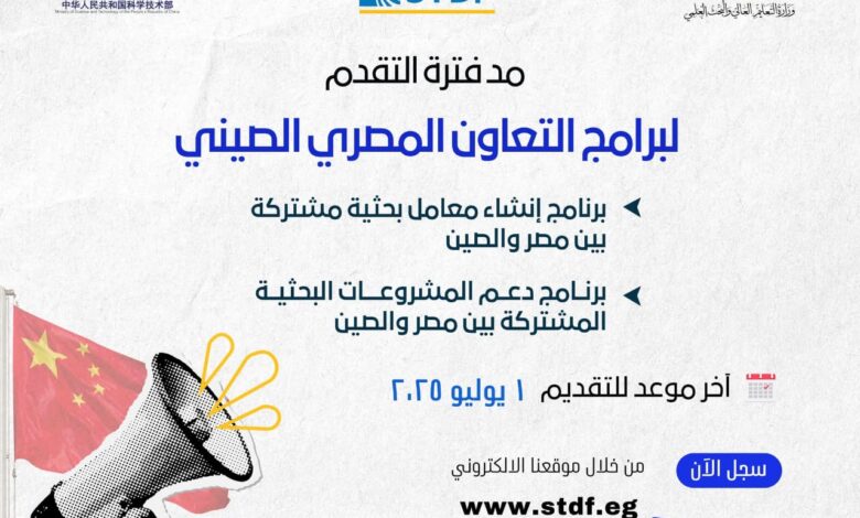 تُعلن هيئة تمويل العلوم والتكنولوجيا والابتكار (STDF)، التابعة لوزارة التعليم العالي والبحث العلمي، عن مد فترة التقدم لبرامج التعاون المصري الصيني، والتي تشمل برنامج إنشاء معامل بحثية مشتركة (النداء الأول)، وبرنامج دعم المشروعات البحثية المشتركة (النداء الثامن)، وذلك في إطار البرنامج التنفيذي الموقع بين حكومتي جمهورية مصر العربية وجمهورية الصين الشعبية.