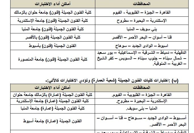 1. كليات الفنون الجميلة (فنون – عمارة) .