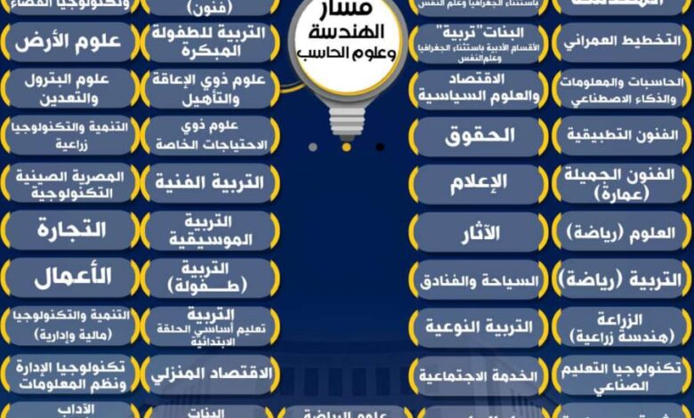 وكذلك تفاصيل الكليات والتخصصات الجامعية المتاحة للشعب المختلفة في الثانوية العامة.