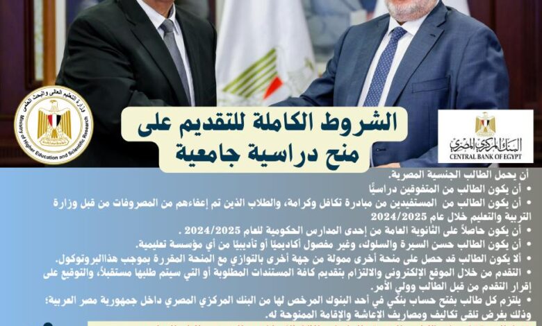 تُعلن وزارة التعليم العالي والبحث العلمي أن اليوم الأحد ١٤ سبتمبر ٢٠٢٥ هو آخر موعد لتلقي طلبات التسجيل في المنحة الدراسية الكاملة المقدمة بالتعاون مع البنك المركزي المصري، والمخصصة لطلاب الثانوية العامة من خريجي العام الدراسي ٢٠٢٤/٢٠٢٥، المستفيدين من برنامج “تكافل وكرامة”، أو المعفيين من المصروفات الدراسية بقرار من وزارة التربية والتعليم، على أن يكونوا من خريجي المدارس الحكومية، ولم يسبق لهم الحصول على منحة دراسية أخرى.