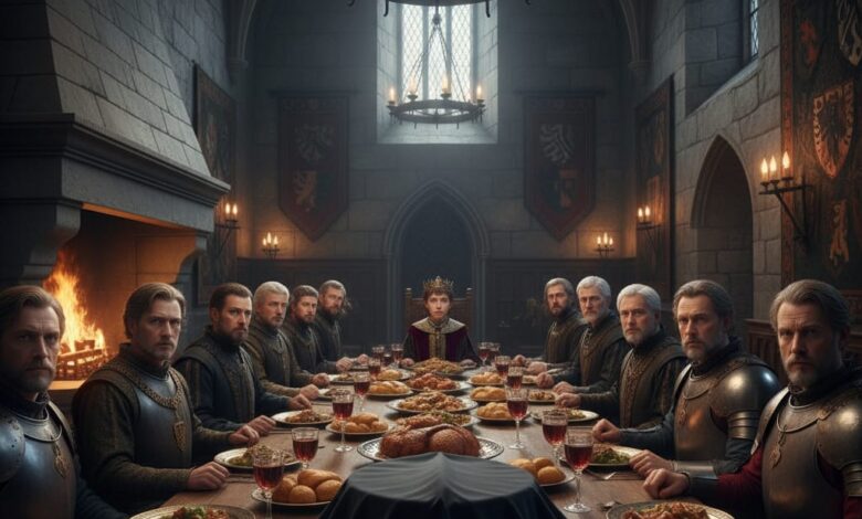 داخل القلعة الملكية دبّت الأضواء والأنغام، مائدةٌ أُعدّت بعناية فائقة، وُضع عليها أشهى اللحوم والخبز الدافئ، وتزيّنت بكؤوس خمرٍ براقة تحت ألسنة المشاعل.