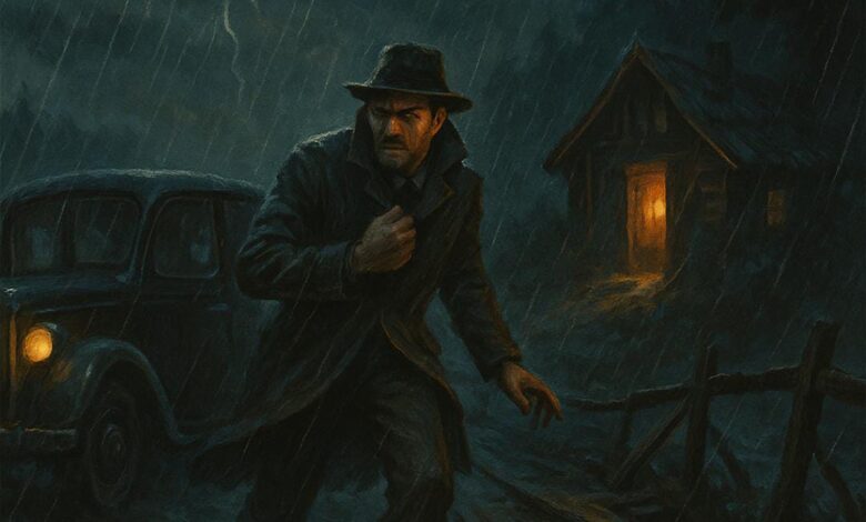 رجل يقف عند العتبة، يرتدي معطفًا أسود طويلاً، وقبعته تخفي نصف وجهه، ملامحه كانت مُرعبة.