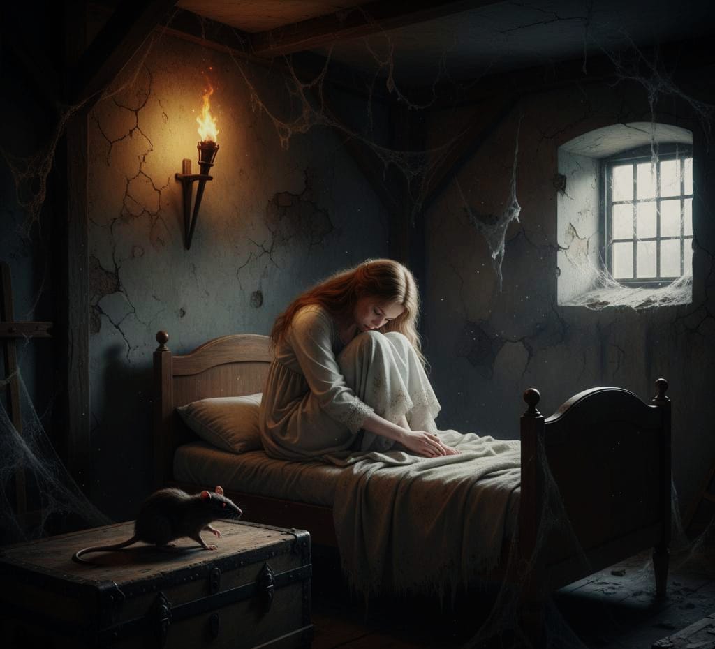 أرقدُ بسريرٍ لا يليق بجسدٍ مثيرٍ ورشيق. شراشفُ تخجلُ من رداءتها أن تُغطّي جمالي الآخاذ وأن تُلامس شعري الذهبي، الذي كان يزهو تحت شعاع الشمس المُشْفِق، في غرفةٍ مُظلمةٍ تغمرها الرطوبة ورائحة العَفَن. يُصاحبني فأرٌ يبدو عليه العجز.