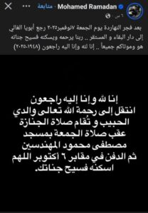 وأضاف انا لله وانا اليه راجعون انتقل الى رحمة الله تعالى والدى الحبيب وتقام صلاة الجنازة عقب صلاة الجمعة بمسجد مصطفى محمود المهندسين ثم الدفن فى مقابر ٦ اكتوبر اللهم اسكنه فسيح جناتك”