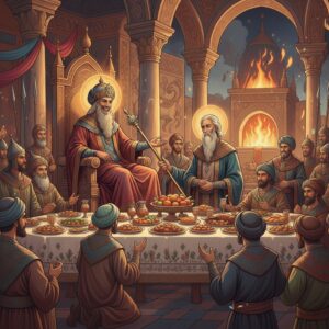 ملك اسمه بلشاصر كان بيعمل حفلة كبيرة ، واستخدم أواني الهيكل المقدسة بطريقة غلط.