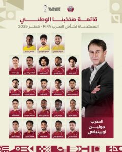 كشف الاتحاد القطري لكرة القدم، عن قائمة لاعبي منتخب كرة القدم الأول بقيادة جوليان لوبيتجي، لخوض منافسات بطولة كأس العرب، والتي تستضيفها الدوحة، خلال الفترة ما بين 1 لـ 18 ديسمبر المقبل.