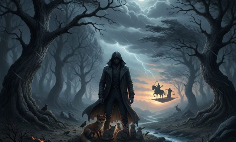 في ليلة عاصفة تنذر بالخطر والوجل ووحشة في المكان، ورياح تشتد عند الفجر وحفيف الأشجار يملأ الكون إنذارًا ووعيدًا ووجلًا وفرقًا، وصوت الضفادع من جدول صغير يكمل لوحة الخوف والهلع في الحال.