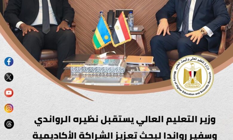 استقبل الدكتور عبدالعزيز قنصوة، وزير التعليم العالي والبحث العلمي، الدكتور جوزيف نسينجيمانا، وزير التربية والتعليم بجمهورية رواندا والمبعوث الخاص لفخامة الرئيس الرواندي “بول كاجامي”، والسيد السفير دان مونيوزا سفير رواندا في مصر، لبحث سبل تعميق التعاون الاستراتيجي في مجالات التعليم العالي والبحث العلمي بين البلدين، وخلال الاجتماع ناقش الجانبان سبل دفع عجلة التعاون البحثي في المجالات ذات الأولوية القصوى للبلدين، وفي مقدمتها: الزراعة، والمياه، والطاقة المتجددة، وذلك من خلال مشاريع بحثية مشتركة تهدف إلى تقديم حلول مبتكرة تدعم التنمية المستدامة.