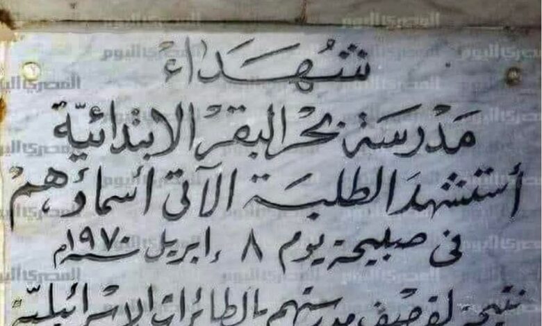 أذاع الراديو الكلمات التالية، التي فتحت جرحًا عميقًا في مصر كلها: “أيها الإخوة المواطنون جاءنا البيان التالي. أقدم العدو في تمام الساعة التاسعة وعشرين دقيقة على جريمة جديدة تفوق حد التصور، عندما أغار بطائراته الفانتوم الأمريكية على مدرسة بحر البقر الابتدائية المشتركة بمحافظة الشرقية، وسقط الأطفال بين سن السادسة والثانية عشر تحت جحيم من النيران”.